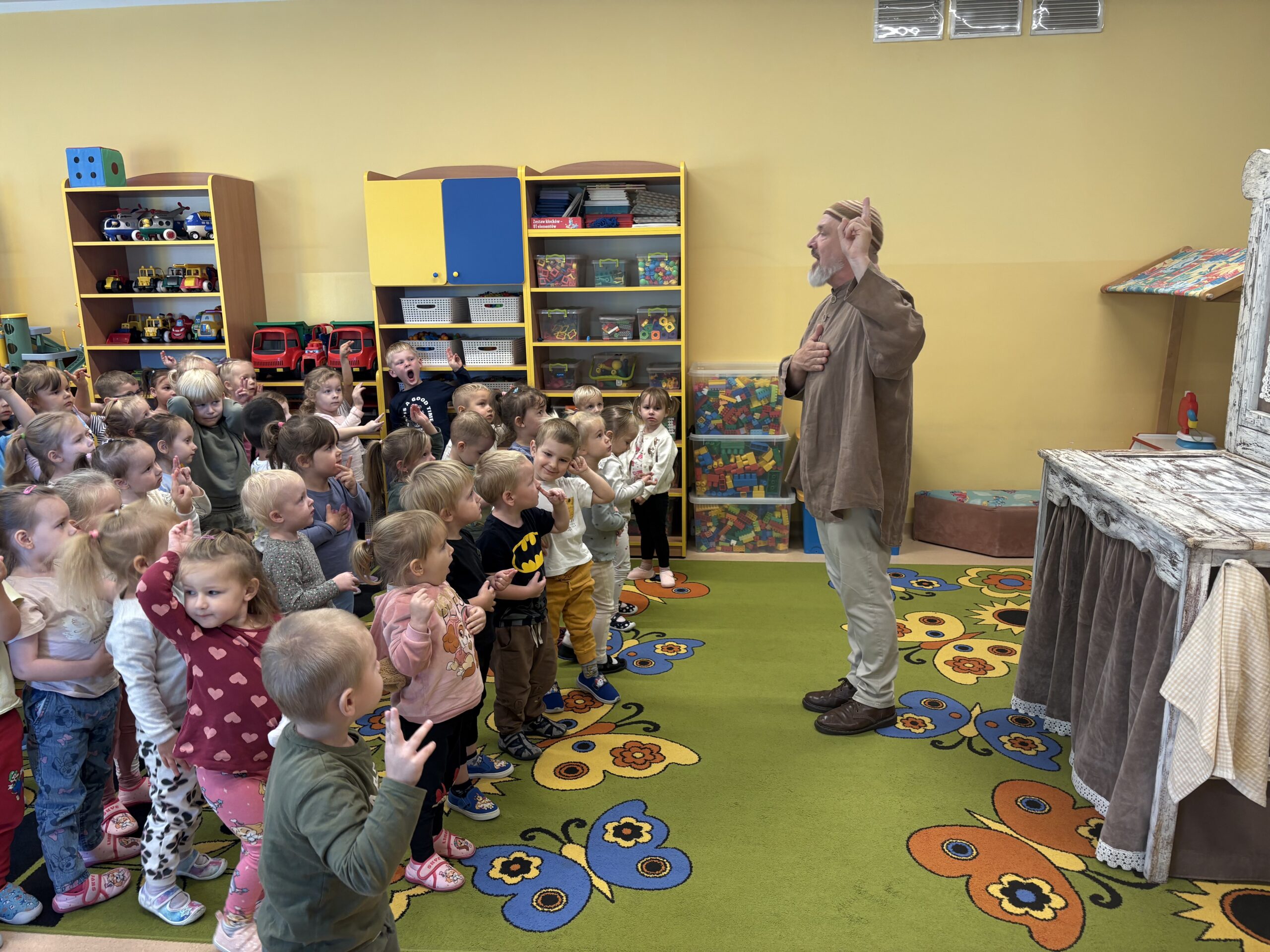 W naszym przedszkolu gościł Teatr Pod Orzełkiem ze spektaklem „Opowieść starego kredensu”. Przedstawienie w konwencji teatru przedmiotu opowiadało legendę o Złotej Kaczce i bajkę o Grzecznym Rycerzu. Bohaterami były kuchenne przedmioty, które ożyły na scenie, tworząc bajkowy świat pełen humoru i fantazji. Dzieci z entuzjazmem złożyły rycerskie ślubowanie, zostając Rycerzami Grzeczności.