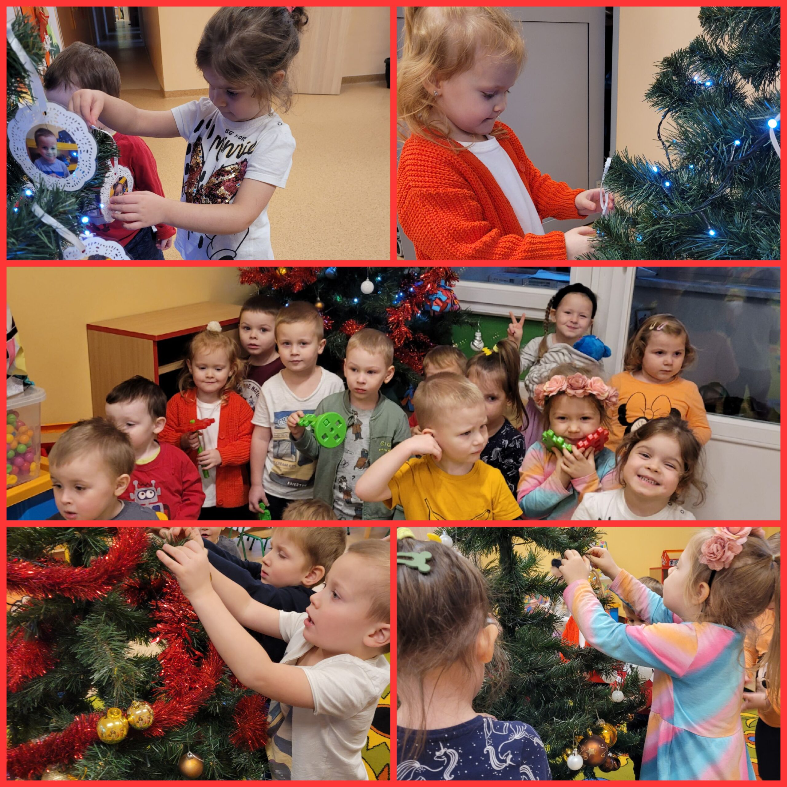 Dzieci z grupy Krasnoludki pięknie przystroiły choinkę grupową oraz przedszkolną.